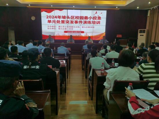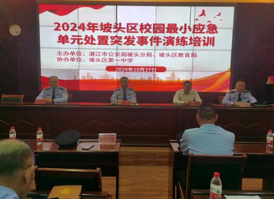 2024 年10 月 27 日(星期 日 )上午,坡头区教育局联合湛江市公安局坡头分局在坡头区第一中学举办2024 年校园 最小应急单元处置突发事件演练培训。区教育局副局长陈安寨、市公安局坡头分局副局长黄永春及副局长袁建毅出席了这次培训会,参加这次培训会的还有湛江市公安局坡头分局治安大队、刑侦大队、各派出所、全区所有中小学校及幼儿园。