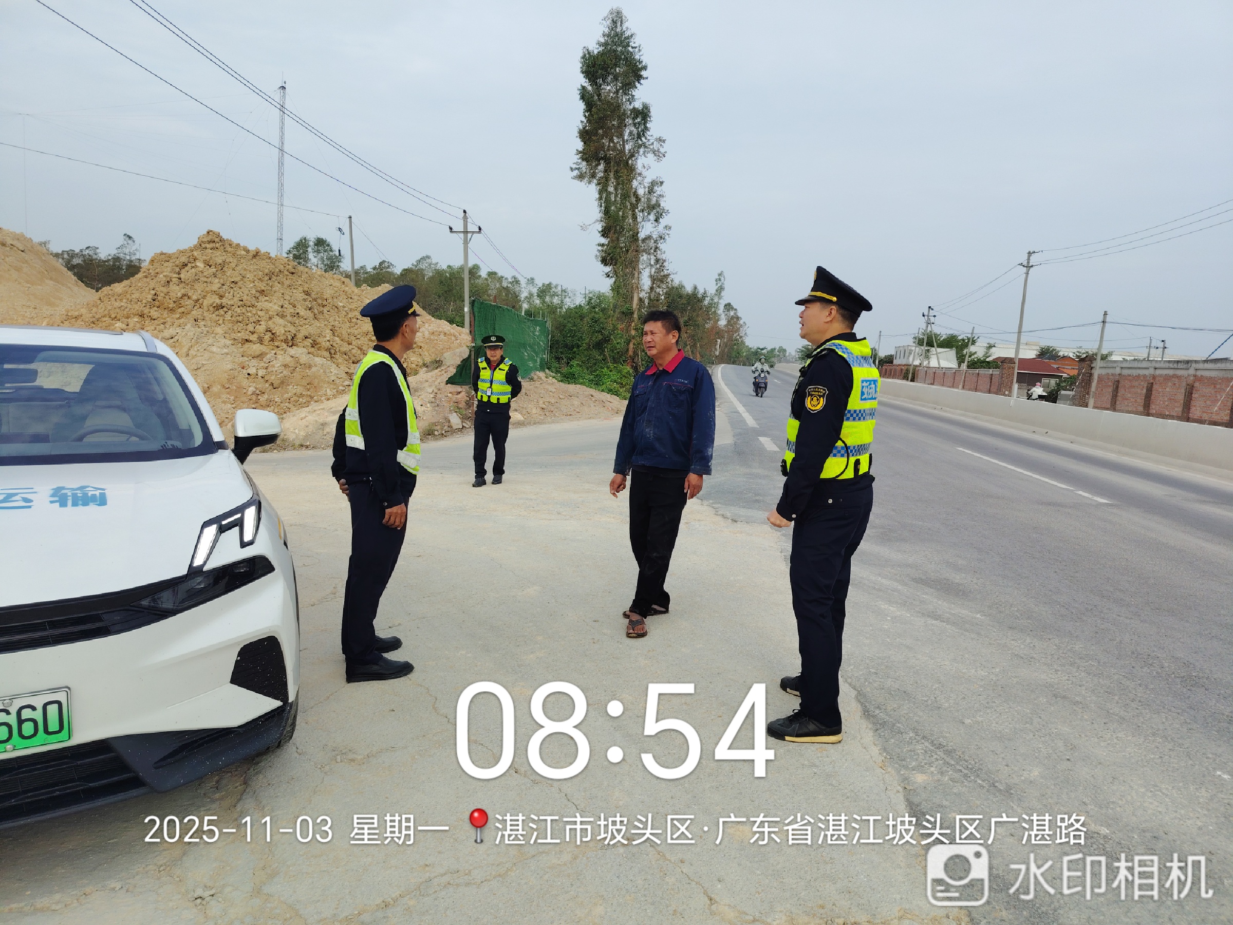 2025年11月3日,坡头区交通运输局执法人员在辖区内开展道路安全执法检查,确保我区道路安全畅通。