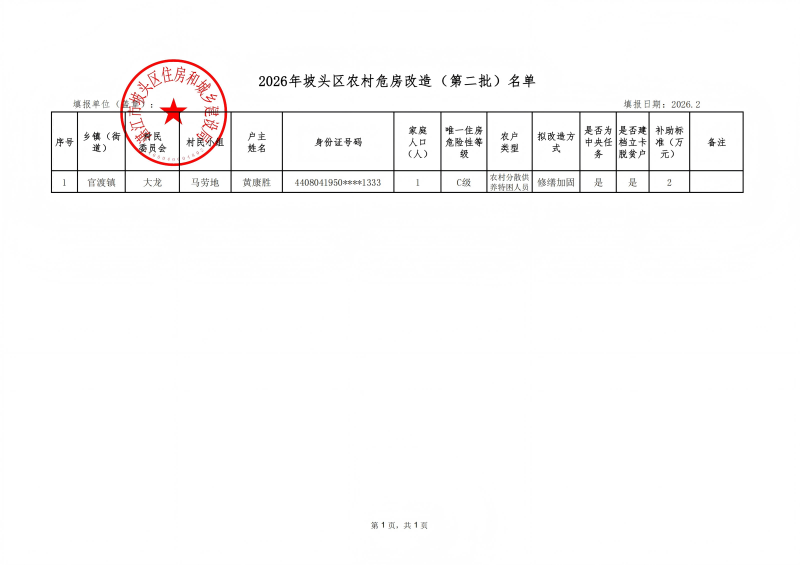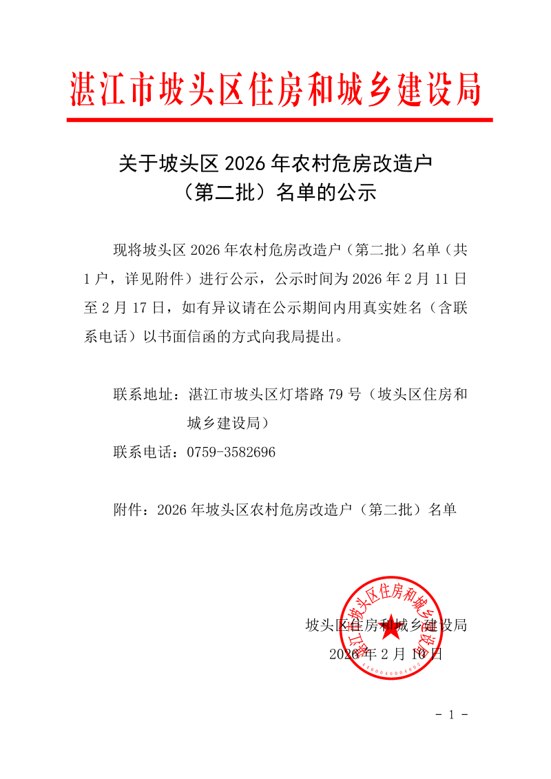 关于坡头区 2026 年农村危房改造户(第二批)名单的公示