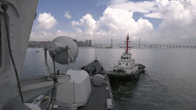 9月5日上午9时30分,随着指挥员一声“二缆收回”的口令,退役湛江舰在两艘拖船的牵引下,平稳地离开麻斜军港码头,开始驶入移交地方投身国防教育的新征程。