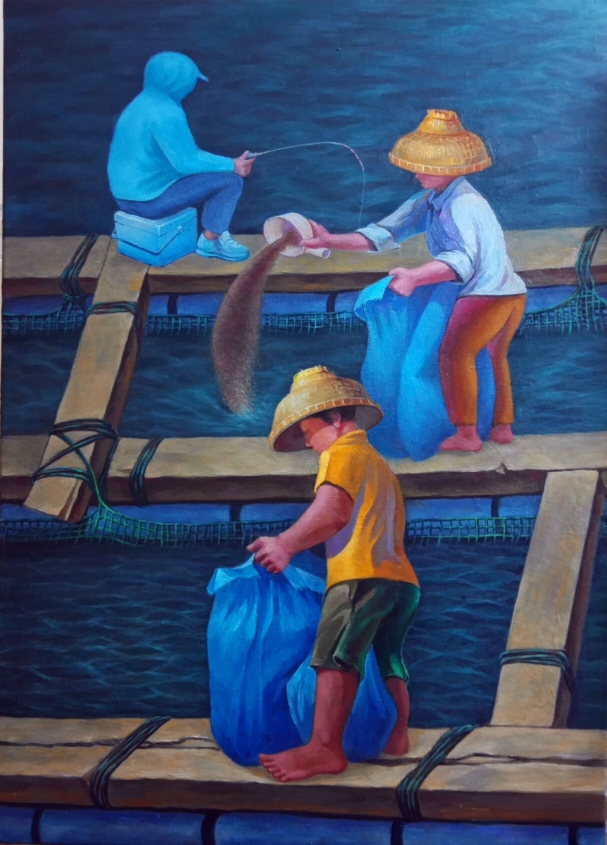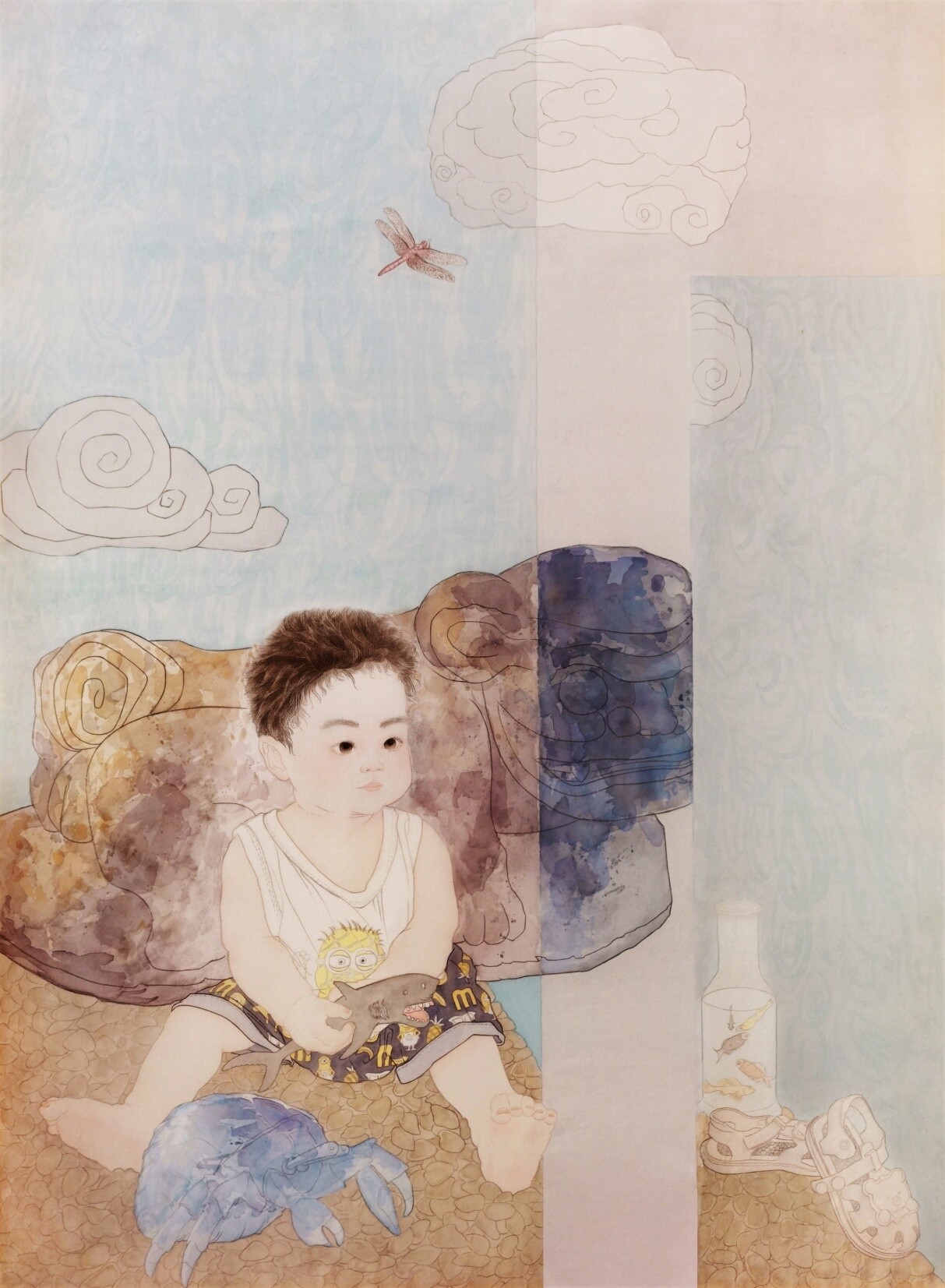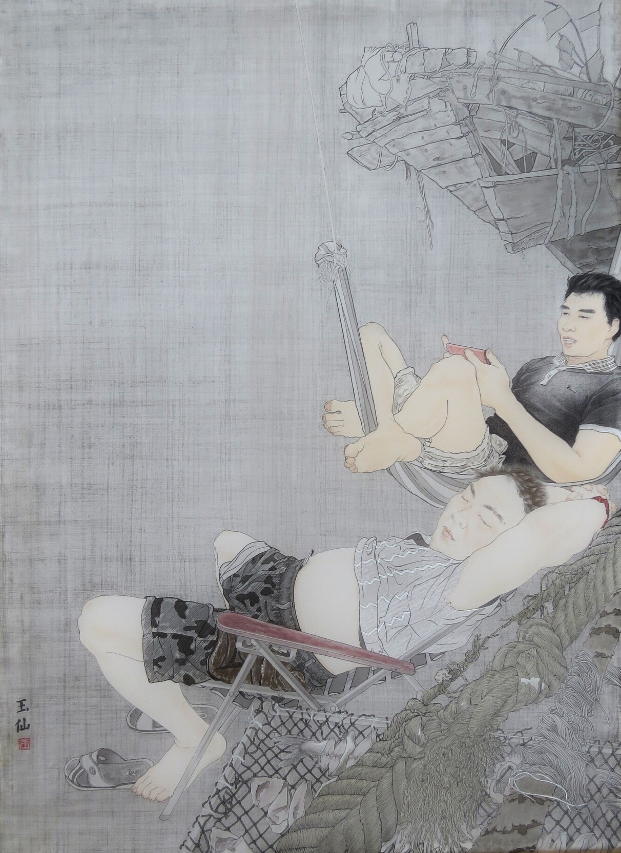 林玉仙《姐姐到底抓了几条鱼》中国画110X80cm