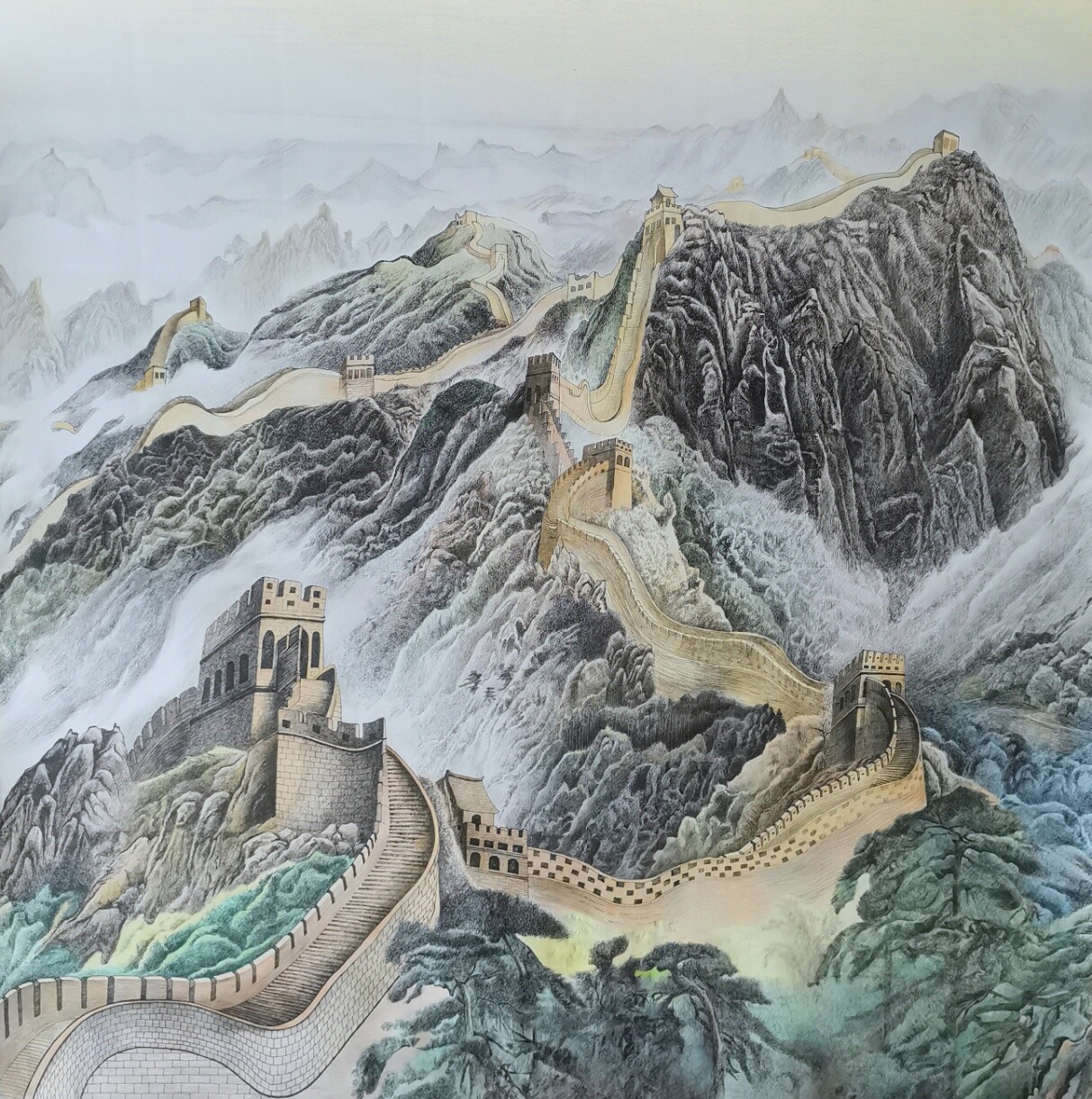秦贤《长城》钢笔淡彩85X85cm