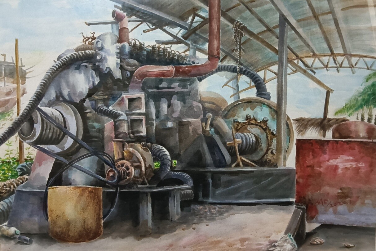 莫彦斌《被查扣的抽沙船》水彩51X75cm