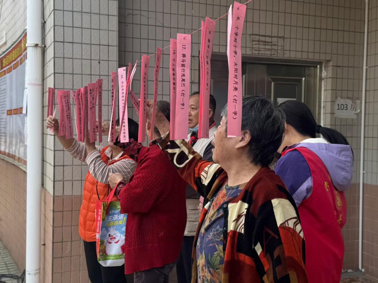 本次游园会以“睦邻游园乐,社区共团圆”为主题,精心设置了4项趣味互动游戏和暖心便民摊位,辖区群众有序参与各项活动,在欢乐中感受年味、收获温暖。套圈圈摊位是本次游园会最吸睛的摊位,肥硕健壮的活鸡、新鲜瓜果蔬菜现场列队,等待“神投手”们前来挑战。李阿姨手持圈环全神贯注瞄准目标,伴随着阵阵欢呼,她一击即中,抱着圈中的鲜活肥鸡乐开了花。滚瓶子挑战摊位,轻轻一推,瓶子旋转定格美好,即可解锁对应区域的惊喜礼品,在轻松互动中收获快乐,把新春好运“滚”回家。猜谜摊位前,千条谜语暗藏玄机,诗词典故、趣味字谜、生活常识全覆盖,猜对即可兑换精美小礼品,在益智比拼中感受传统文化魅力。现场还有投壶等互动游戏吸引大小朋友积极参加。而在便民暖心服务摊位,品尝糖水、爆米花、免费磨刀等服务精准对接群众生活需求,志愿者们用温情服务为长者们提供游玩间隙休息、补充能量的空间。活动现场欢呼声、喝彩声、掌声交织成曲,让即将到来的春节暖意融融。