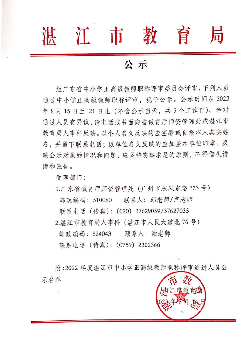 2022年度湛江市中小学正高级教师职称评审通过人员名单公示