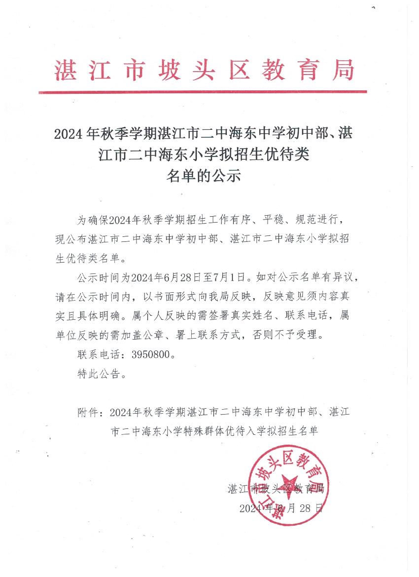 2024年秋季学期湛江市二中海东中学初中部、湛江市二中海东小学拟招生优待类名单的公示