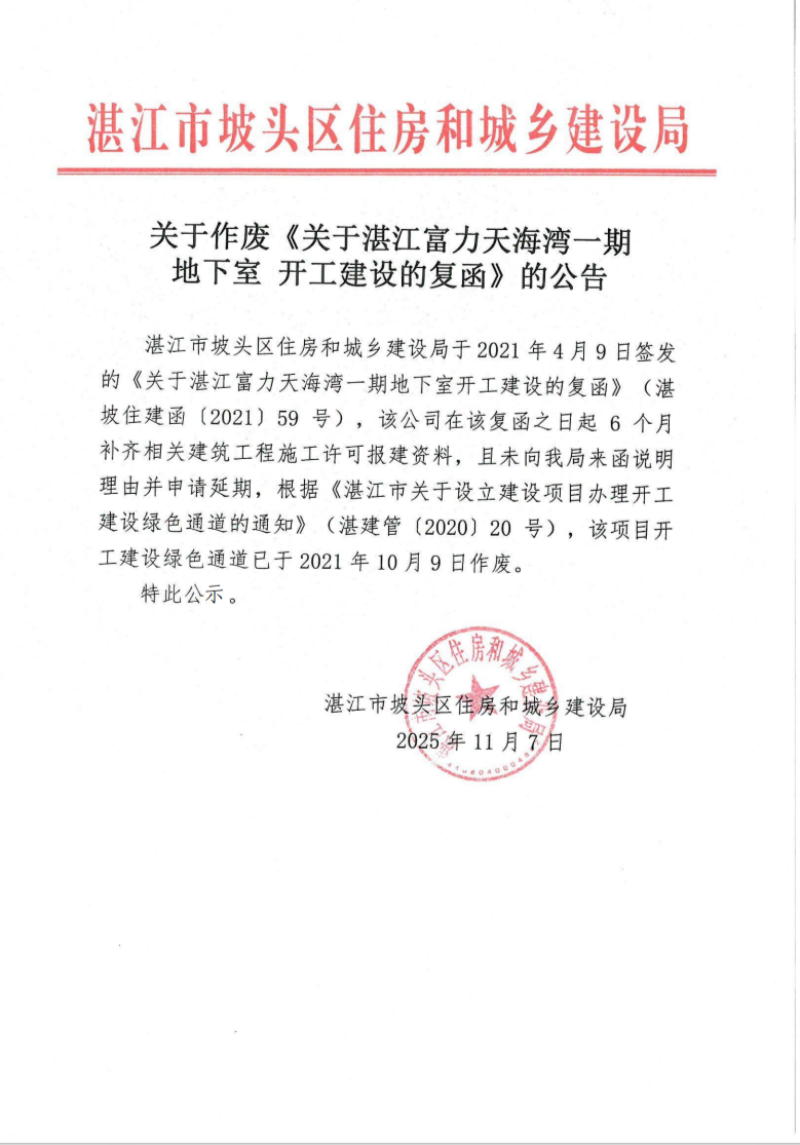 关于作废《关于湛江富力天海湾一期地下室开工建设的复函》的公告