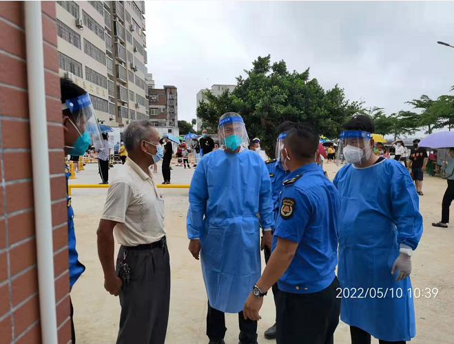 随着疫情的变化,封控区的压力越来越大,在区的统一调配下,我局党员干部主动请缨,报名前往封控区。截止现在我局共组织29人深入官渡的丰山村、三角村、官渡社区等村(社区)。“城管蓝”化身“大白”,听从指挥,认真做好封控区、管控区出入口的查证、验码、测温、登记管理、维持秩序等工作。为封控区内每家每户分发物资、上门检测核酸、收集生活垃圾等,并向群众耐心解释居家隔离的问题和适当的心理疏导。五月的港城,天气异常闷热,但在那一面面迎风招展鲜红的党旗下,总会看到一个个的城综局志愿者忙碌的身影,护目镜下是他们红肿的双眼,防护服里经常是汗流浃背。他们用默默的坚守和奉献,为大家筑起疫情防控的坚固防线。