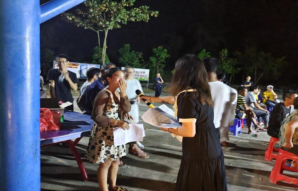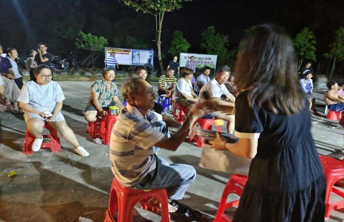 第二个环节是讲解乡村振兴、农村人居环境整治、村规民约等相关知识,随后进行有奖问答,答对的村民群众则可获得精心准备的精美奖品一份,大家的热情很快就被调动起来,纷纷举手答题,晚会现场气氛热烈。