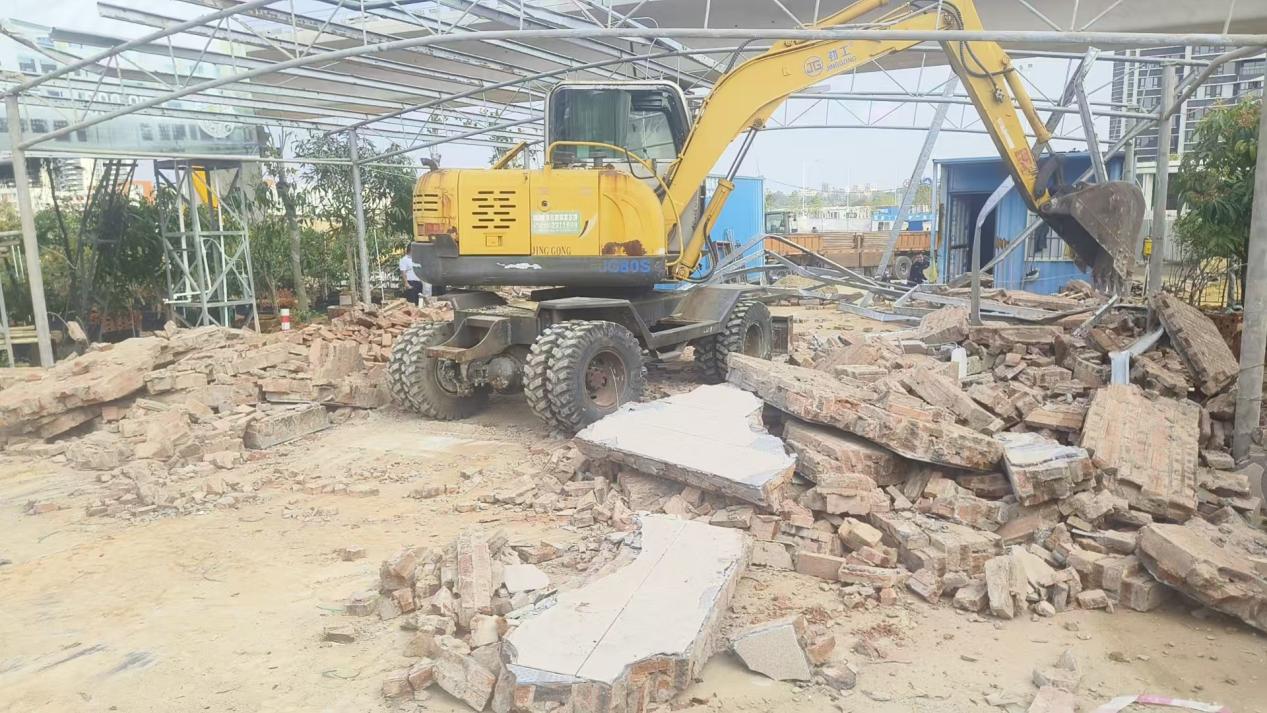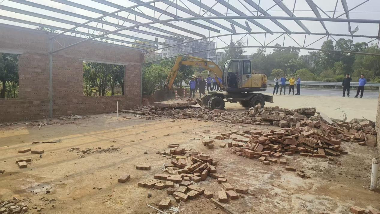 我局接到区府的指示后,党组高度重视,开展专题研究。成立专项工作组,积极联合坡头区征地办、南调街道办执法队、麻东村委会征地小组、麻东村委会等部门制定拆除方案,明确分工及应急预案。2025年3月26日,我局共派出13名执法人员,4辆执法车,挖掘机1台。由詹举勇副局长带队,依法对海川快线采摘园存在的违规搭建进行处理,此次行动共拆除违规建筑1处,清理占地70平方米,恢复公共空间及绿化带70平方米。 现场设置警戒线,疏散无关人员,确保拆除安全,全程录像取证,确保程序规范。
