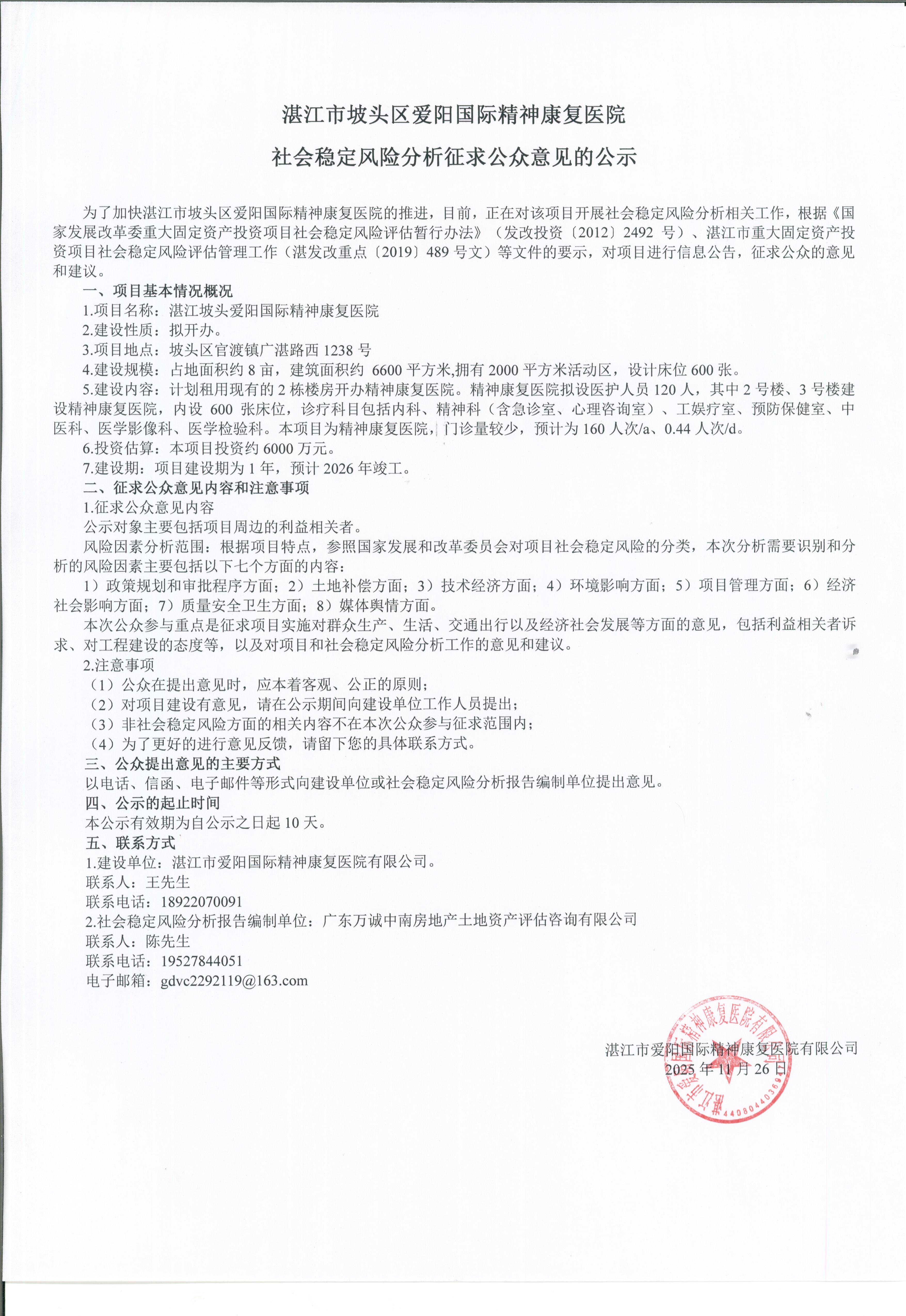 风险分析公示---湛江市坡头区爱阳国际精神康复医院社会稳定风险分析征求公众意见的公示.jpg 2025年11月26日