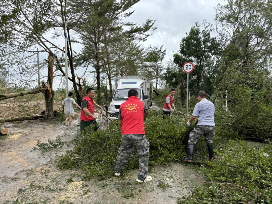 张明辉(中)在台风“麦德姆”后与干部们开展扶正苗木、清理路障等工作。