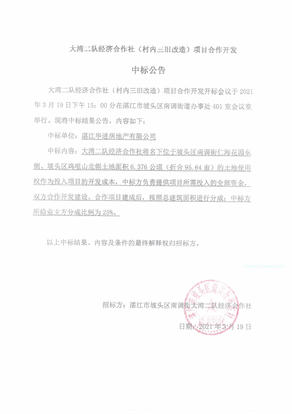 大湾二队经济合作社(村内三旧改造)项目合作开发成交确认书及中标公告.pdf