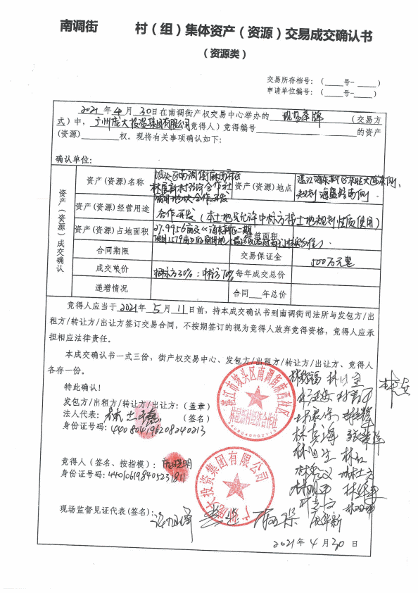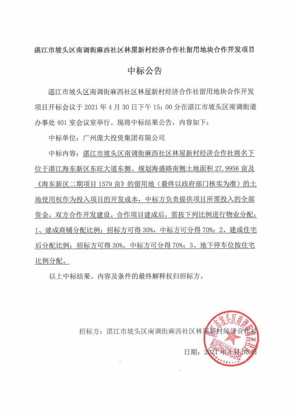 湛江市坡头区南调街道麻西社区林屋新村经济合作社留用地块合作开发项目中标公告及确认书