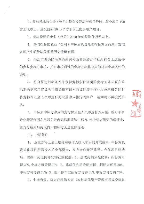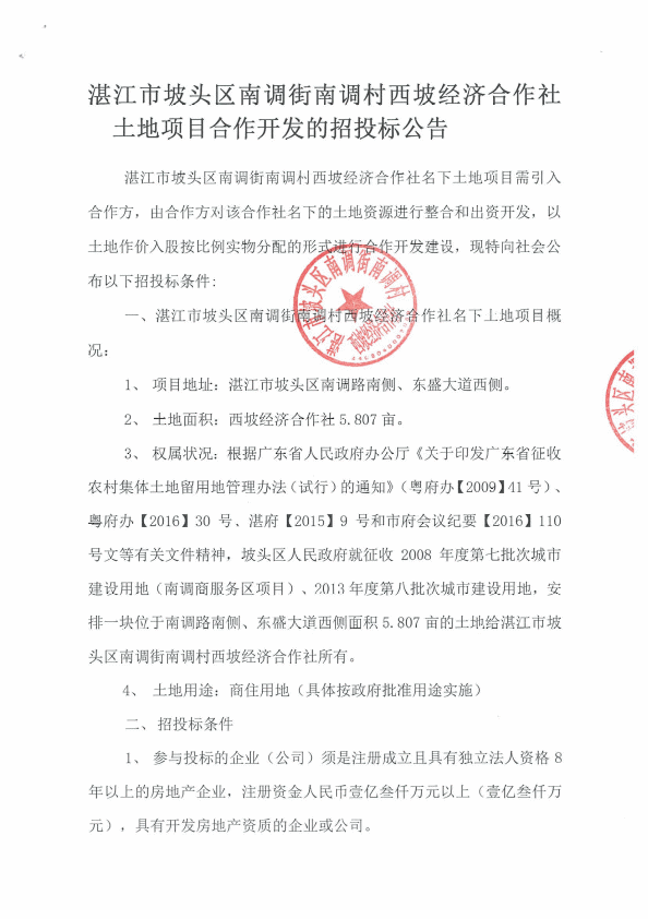 湛江市坡头区南调街南调村西坡经济合作社土地项目合作开发的招投标公告