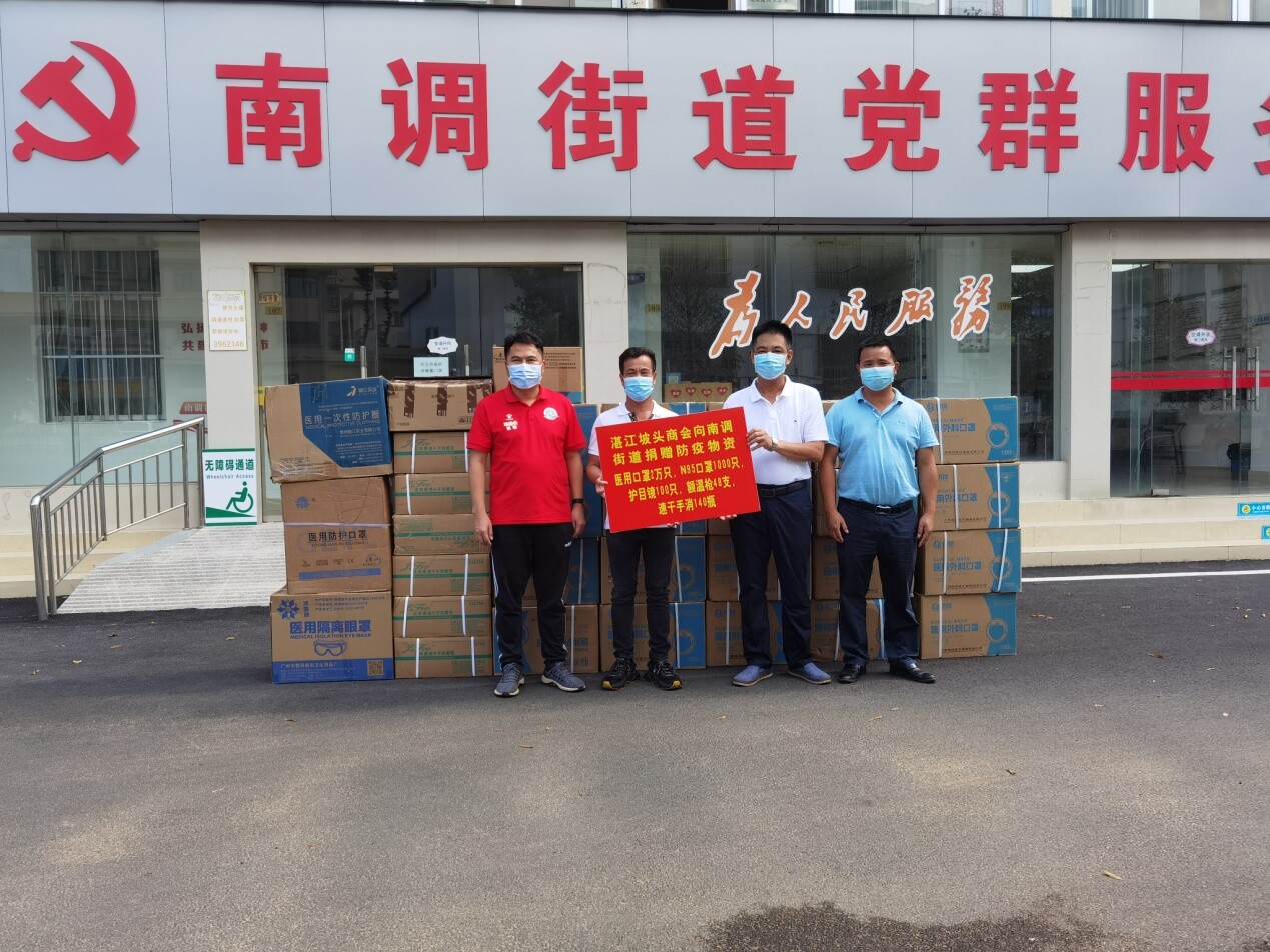 疫情防控形势严峻,牵动着爱心乡贤的心。了解到家乡防疫物资紧缺,2021年6月18日下午,湛江坡头商会会长许振伟先生带领员工向南调街道捐赠防疫物资,将医用口罩2万只、N95口罩1000只、护目镜100只、额温枪48支、防护衣50套、速干医用手消毒液140瓶运送到了南调街道抗疫一线。