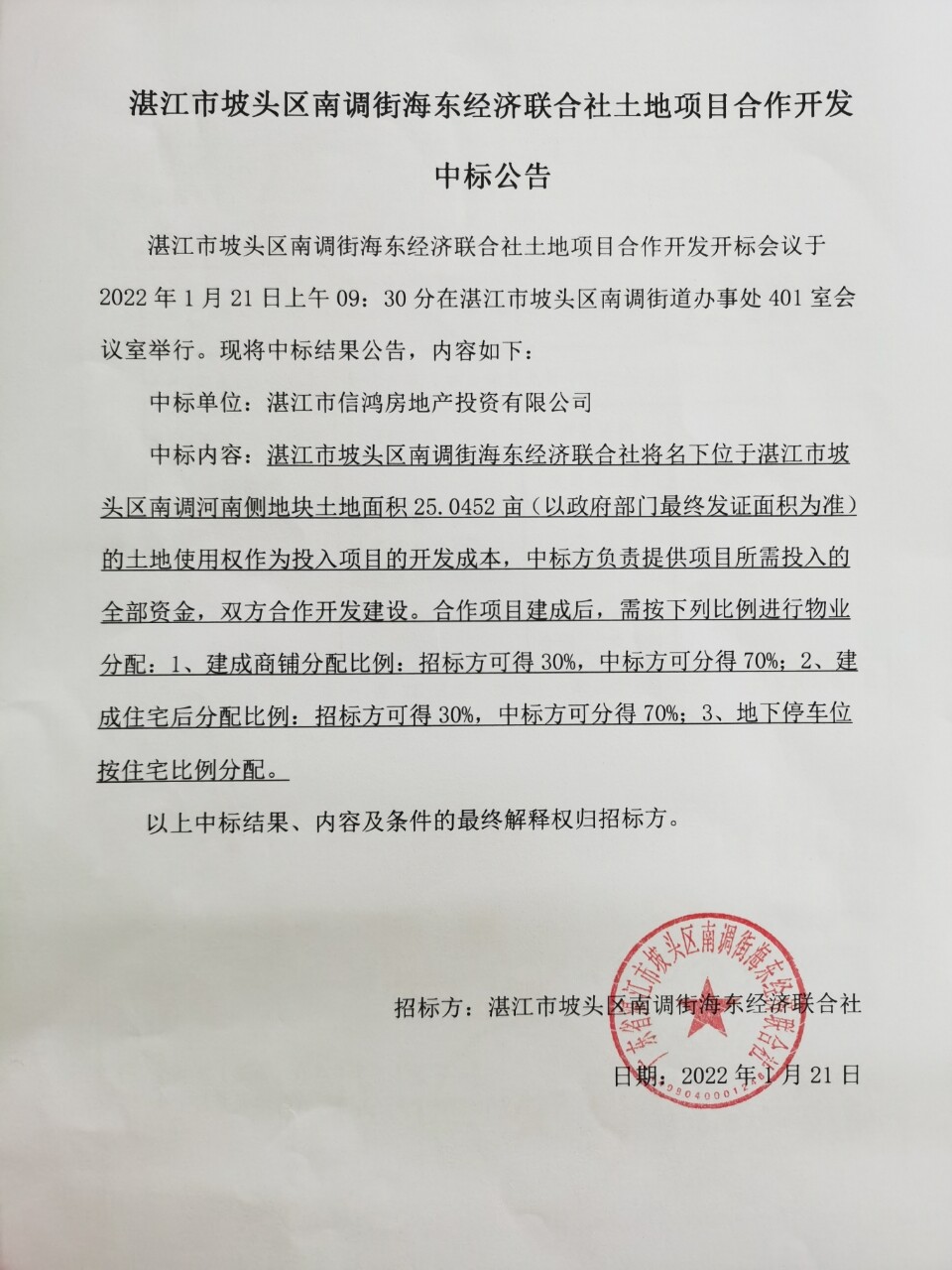 湛江市坡头区南调街海东经济联合社土地项目合作开发中标公告.pdf