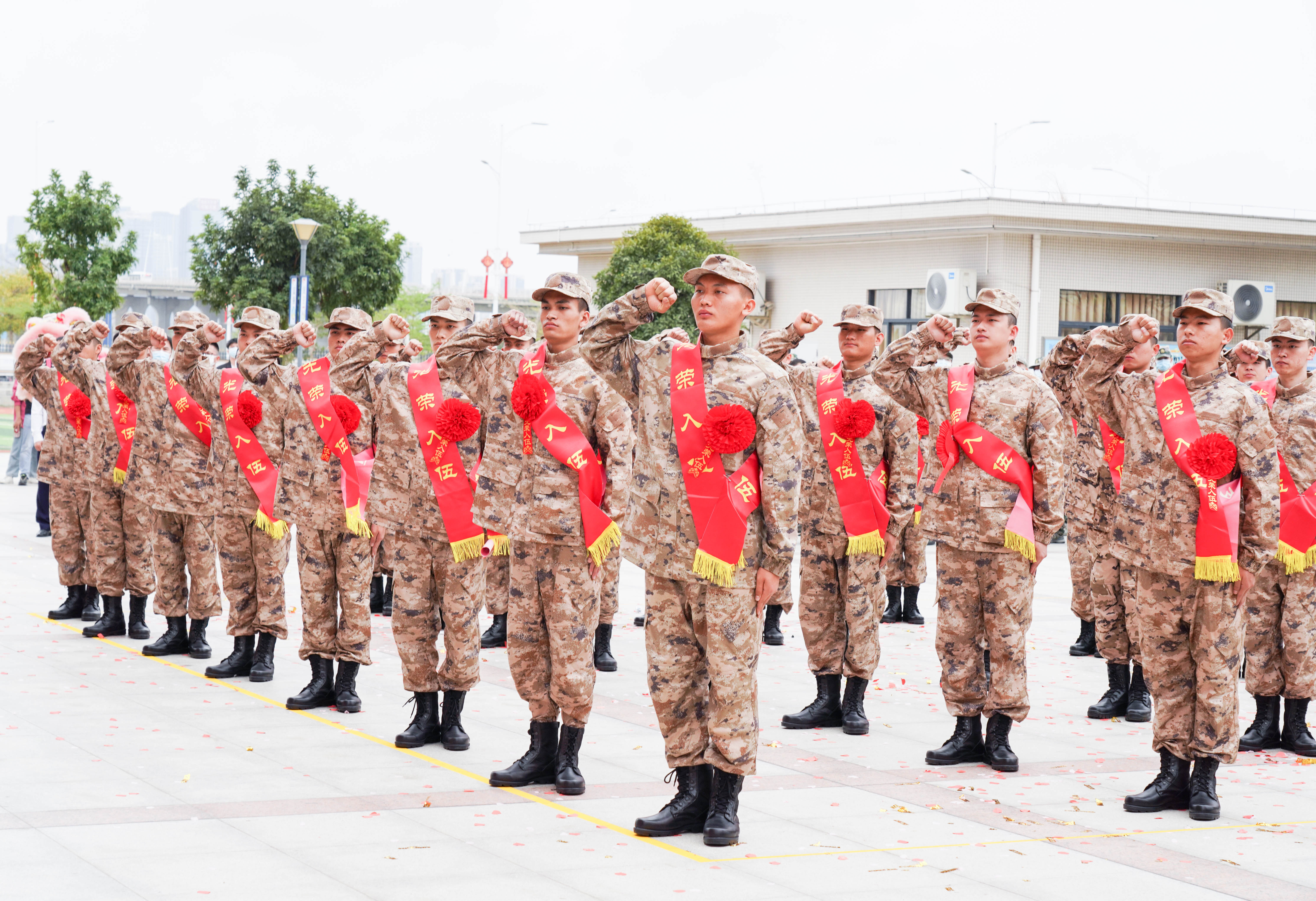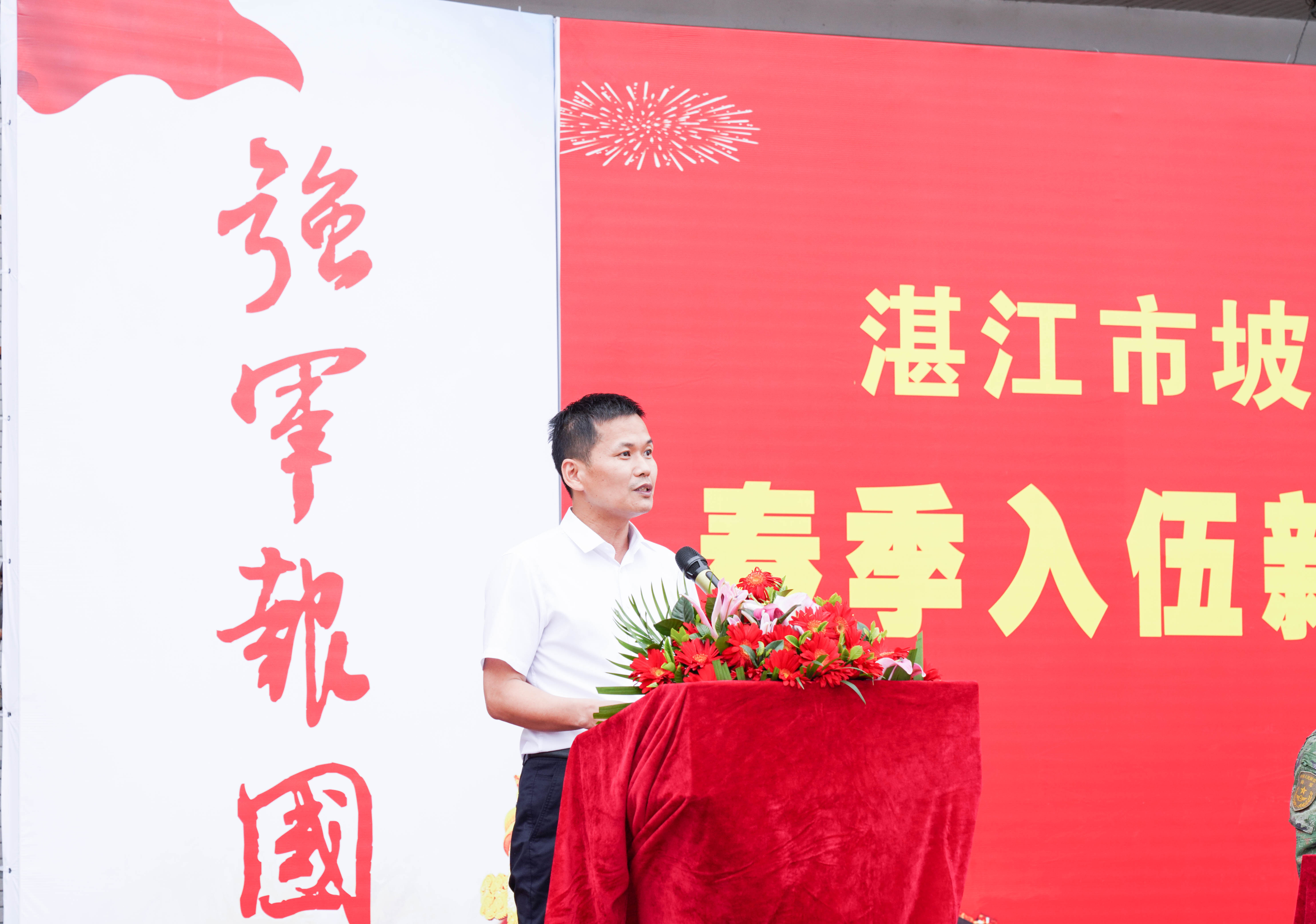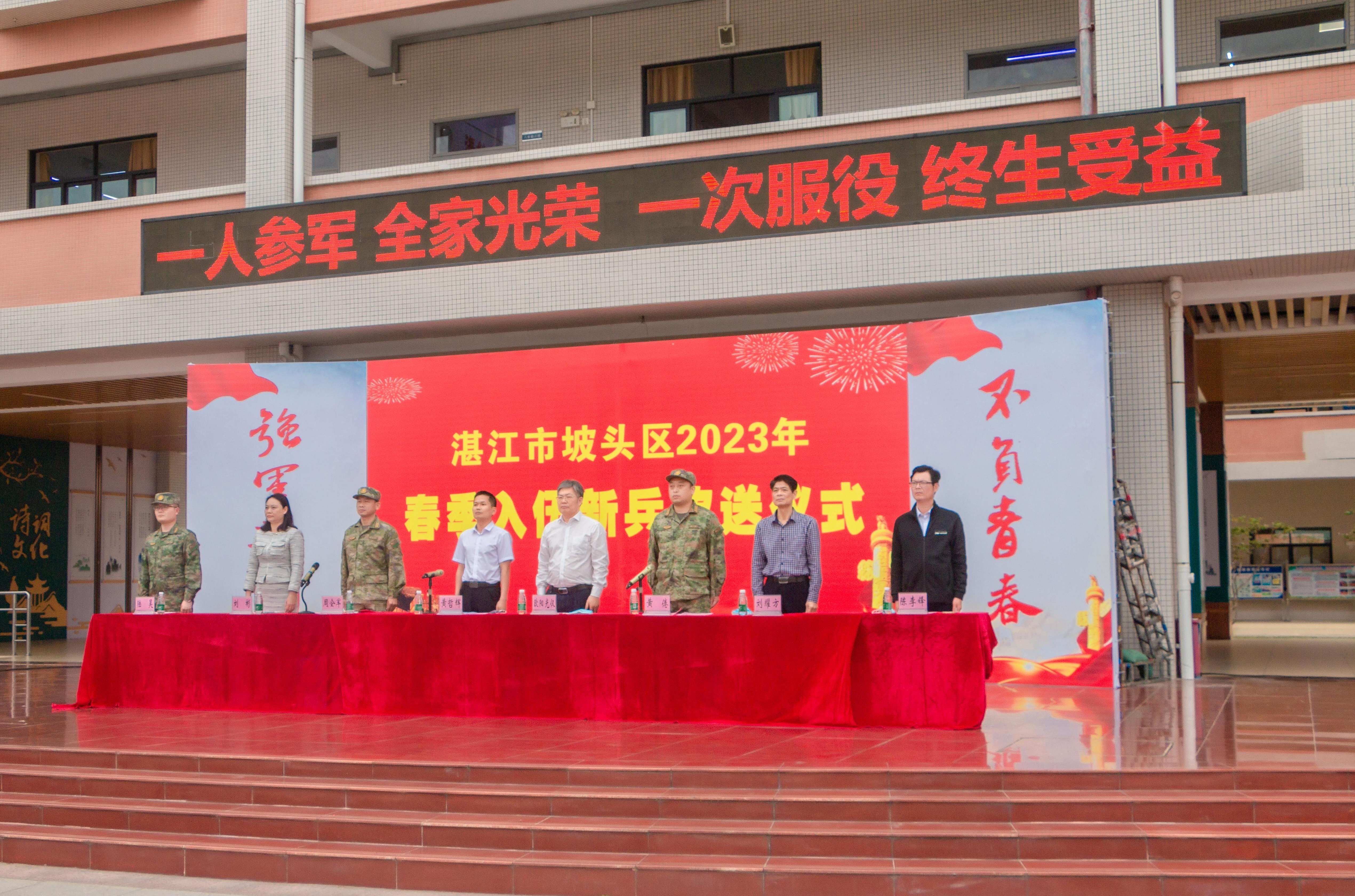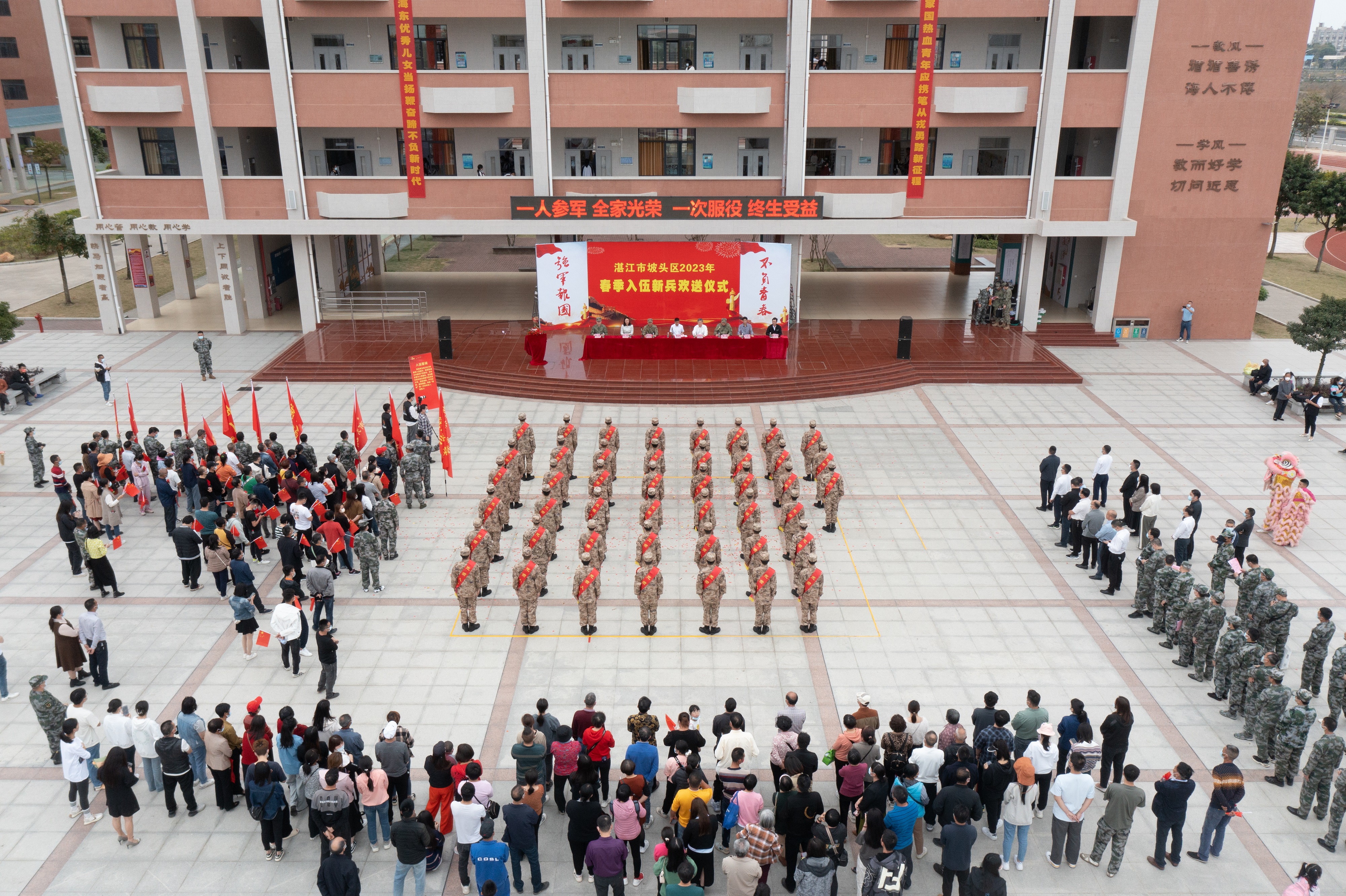 猎猎红旗,如诗年华。《少年先锋队队歌》、《强军战歌》接力传唱,湛江三十二中少先队员与新战士用歌声激荡出传承党的事业的共鸣,龙狮起舞和着铿锵锣鼓声承载着家乡父老的殷切希望和美好祝愿。在宣布2023年春季新兵入伍决定后,区领导和各镇街领导为全体新兵佩戴绶带和红花,激励他们“不忘初心为人民、牢记使命务打赢”。全体新兵身着崭新军装,军容整肃、意气风发,进行了庄严的入伍宣誓。