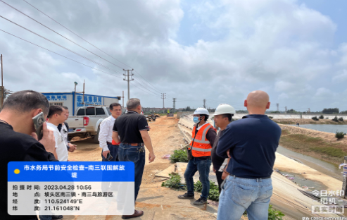 2023年4月28日庞泽文同志陪同市水务局领导到我区南三联围解放堤、龙头镇山车水库等地开展“五一”节前安全生产大检查