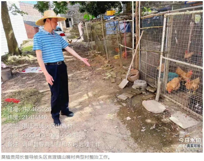 莫植贵局长先后实地走访了坡头区官渡镇山嘴村,麻章区麻章镇厚礼南村,雷州市客路镇上塘村,廉江市吉水镇乌坭坝村、雅塘镇大人岭村、石颈镇烟塘村,遂溪县港门镇吴家村、乌塘镇山口王村等8个典型村,指出村庄普遍存在“三清三拆三整治”不彻底、污水治理设施运维管理不到位、人居环境整治效果不持久等问题。如坡头区官渡镇山嘴村房前屋后生产工具、建筑材料、柴草乱堆乱放,房前屋后存在多处黑臭水体,卫生死角较多,垃圾收集点管理不到位;麻章区麻章镇厚礼南村农污设施出水口处、水塘沟渠、农房屋后等多处存在黑臭水体,农房外立面整治不到位;雷州市客路镇上塘村垃圾堆场未清运,废弃公厕未清拆,农污设施出水口存在黑臭现象;廉江市雅塘镇大人岭村主干道“四旁五边”杂草丛生,巷道泥泞未硬底化;廉江市石颈镇烟塘村农房屋后等多处存在黑臭水体,卫生死角多,存在“三线”乱拉现象;廉江市吉水镇乌坭坝村施工场地积水严重,生活垃圾较多、保洁不到位,农污设施出水口排水不畅;遂溪县港门镇吴家村房前屋后存在多处黑臭水体,卫生死角杂草丛生,垃圾清理不及时;遂溪县乌塘镇山口王村污水处理设施管护不到位,存在黑臭现象。