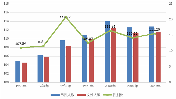 全区常住人口[2]中,男性人口为177820人,占52.65%;女性人口为159903人,占47.35%。总人口性别比(以女性为100,男性对女性的比例)由2010年第六次全国人口普查的110.22上升为111.20.