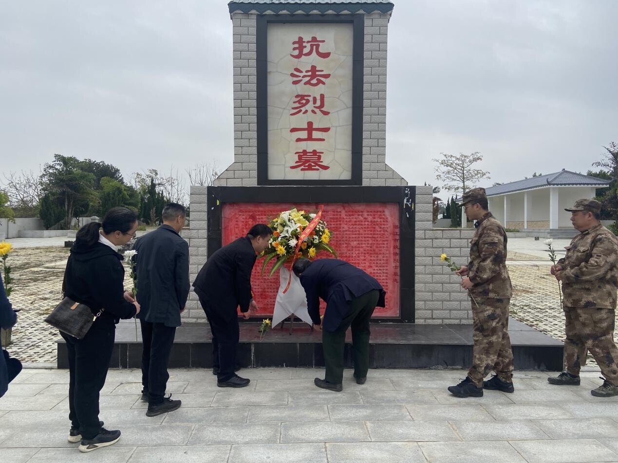 在庄严肃穆的抗法烈士墓前,区退役军人事务局主要领导带领全体人员向革命先烈默哀一分钟,深切悼念革命先烈。随后,由区退役军人事务局、区人武部、坡头镇人民政府领导代表向烈士墓敬献花圈、花篮,全体人员列队逐一向烈士敬献鲜花,向烈士行三鞠躬礼,瞻仰烈士墓碑,表达对革命先烈的崇敬之情。