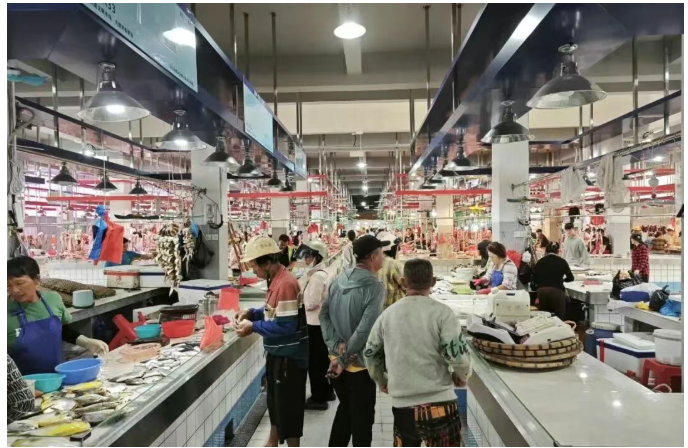 “针对市场分类混乱的情况,我们将市场合理划分为了生鲜区、蔬果区、杂货区、服装区四大功能区,用不同的装修风格进行区分,同时对市场灯泡进行了全面更换,并使用防滑砖对生鲜区进行瓷砖的重新铺贴,改善市场设施残旧、采光不足等情况。”中建八局湛江市龙头镇“百千万工程”项目经理张良介绍。