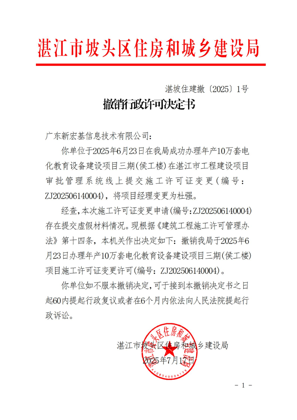 撤销行政许可决定书(湛坡住建撤〔2025〕1号)
