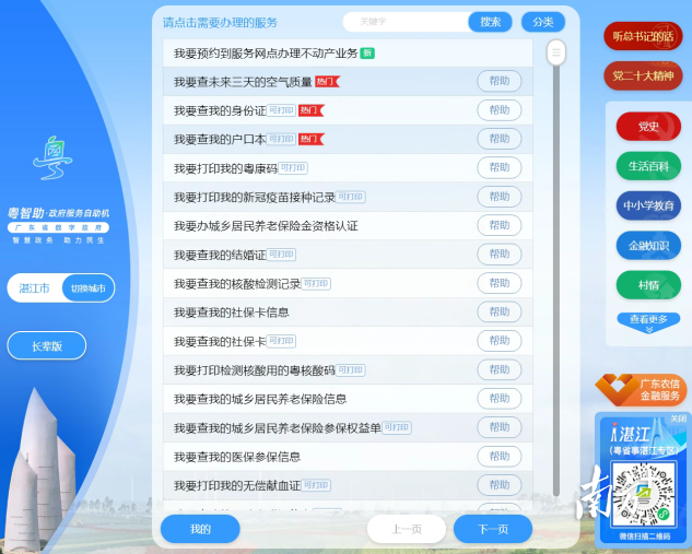 除“粤智助”的特色服务之外,10月27日,“i湛江”正式上线,市民朋友们在“粤智助”首页右下角扫码即可进入“i湛江”小程序页面,公积金、社保、医保、不动产、生活缴费等35类共992项服务事项都能办,有效提升群众办事效率。